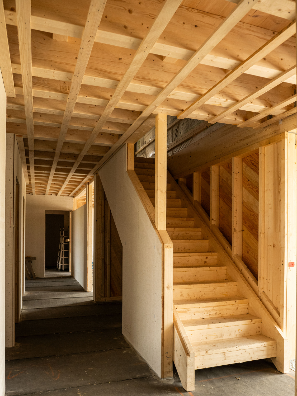 Der neue Einbau wurde konsequent als Holzbau umgesetzt. Vorgefertigte Wandelemente und eine klassische Deckenbalkenkonstruktion ermöglichten eine präzise Ausführung, kurze Bauzeiten und minimale Eingriffe in den Bestand. Holz fungiert dabei nicht nur als tragender Baustoff, sondern prägt auch Atmosphäre, Akustik und Raumwahrnehmung im Inneren. Die Nachhaltigkeit bei diesem Projekt ergibt sich unmittelbar aus dem gewählten Umgang mit dem Bestand. Der vollständige Erhalt der Tragstruktur vermeidet Abbruchabfälle, reduziert den Materialeinsatz und spart einen erheblichen Anteil grauer Energie sowie CO₂-Emissionen ein. Der innere Neubau ist so ausgeführt, dass er auch in Zukunft vielfältige Nutzungsänderungen zulässt und auch rückstandfrei wieder ausbaubar ist. Die Außenanlagen beschränken sich auf das Notwendige, minimieren versiegelte Flächen und fördern Versickerung und Verdunstung.