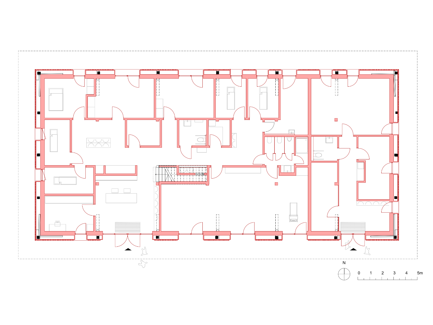 Konstruktiv blieb die bestehende Holztragstruktur vollständig erhalten. Auch die historischen Punktfundamente konnten bewahrt und in eine neue Bodenplatte integriert werden. Wo erforderlich, wurde das Tragwerk behutsam instandgesetzt und statisch ertüchtigt, ohne seine ursprüngliche Logik zu verändern. Dachhaut und Fassadenbekleidung wurden unabhängig von der Tragstruktur erneuert. Ein umlaufendes Lichtband im oberen Fassadenbereich sorgt für eine gleichmäßige Belichtung und natürliche Belüftung der Zwischenzone sowie der dahinterliegenden Therapieräume.