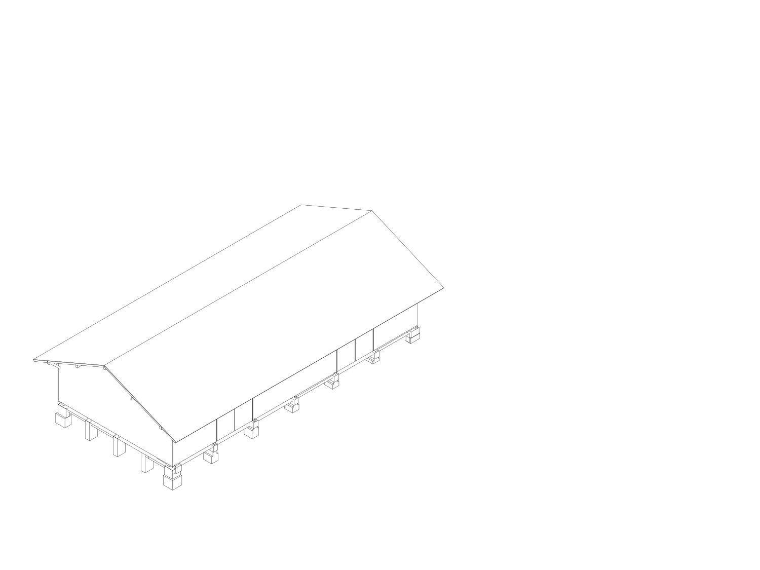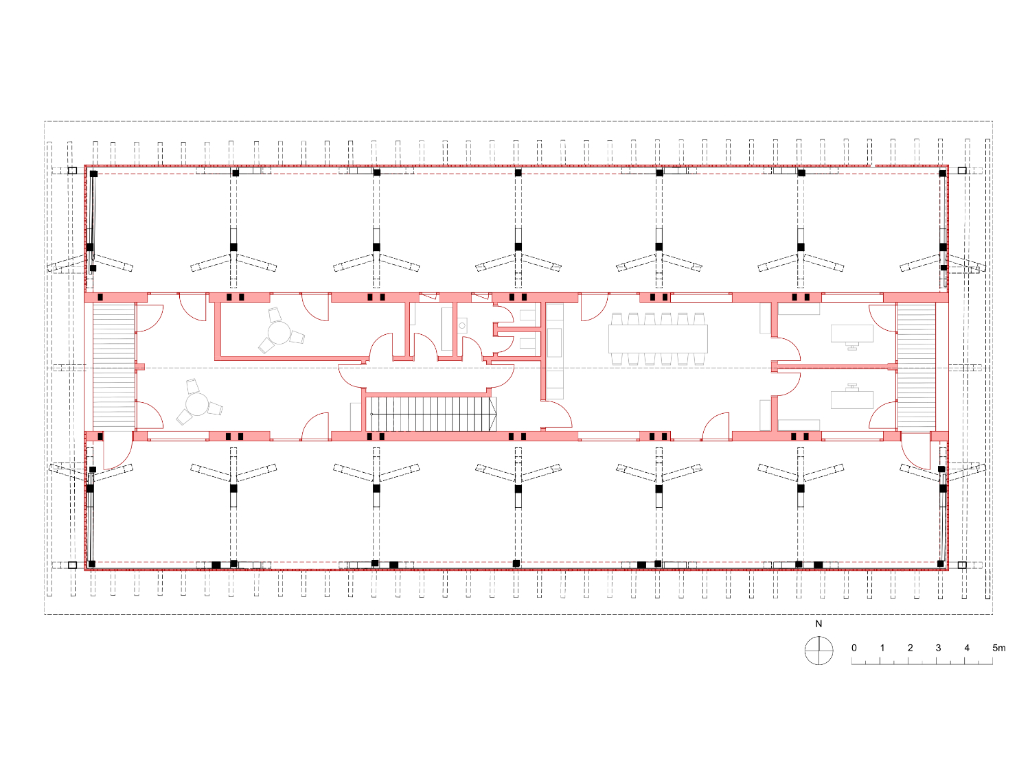 Konstruktiv blieb die bestehende Holztragstruktur vollständig erhalten. Auch die historischen Punktfundamente konnten bewahrt und in eine neue Bodenplatte integriert werden. Wo erforderlich, wurde das Tragwerk behutsam instandgesetzt und statisch ertüchtigt, ohne seine ursprüngliche Logik zu verändern. Dachhaut und Fassadenbekleidung wurden unabhängig von der Tragstruktur erneuert. Ein umlaufendes Lichtband im oberen Fassadenbereich sorgt für eine gleichmäßige Belichtung und natürliche Belüftung der Zwischenzone sowie der dahinterliegenden Therapieräume.